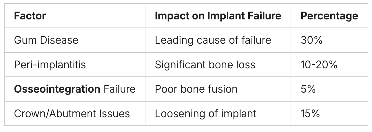 Not taking care of your mouth can cause peri-implantitis. This affects 10-20% of people with implants. It leads to bone loss and can make the implant fail.