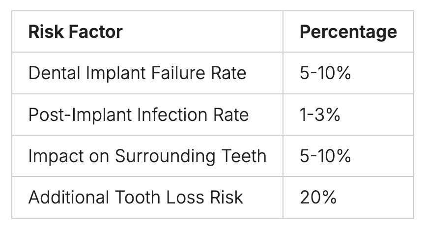 A loose implant can harm nearby teeth and gums. About 5-10% of cases see impacts on surrounding teeth during surgery. Not fixing a loose implant can lead to losing more teeth in about 20% of cases.